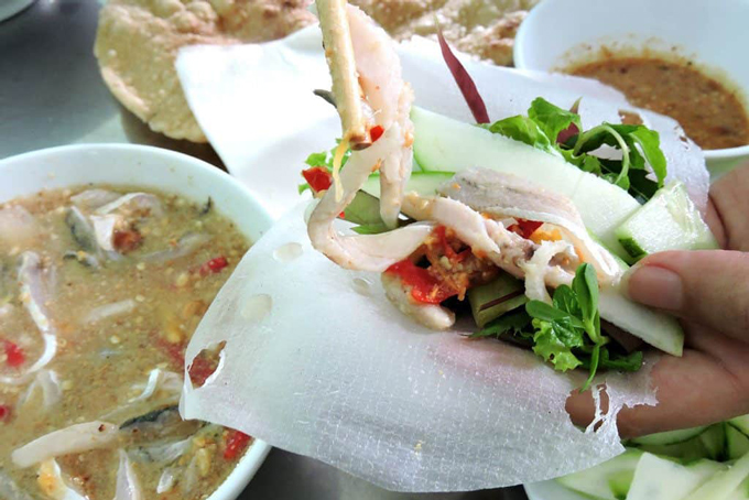 Đầu tiên cần chuẩn bị bánh tráng, đặt các loại rau như xà lách, rau thơm, quế, lá cách và các loại rau rừng khác của Phú Quốc, rồi cho thêm hành tây, dừa đã nạo, cuối cùng là một đến hai miếng cá trích, cuốn lại giống như gỏi cuốn chấm với nước chấm để ăn. Nước chấm là sự hòa quyện của ớt băm, đậu phộng xay nhuyễn và nước mắm Phú Quốc nổi tiếng.