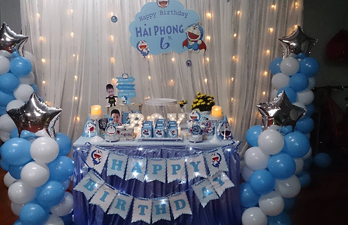 Màu chủ đạo của bữa tiệc sinh nhật cho bé trai với chủ đề Doraemon là màu xanh nước biển. Bạn sử dụng những quả bóng bay tạo hình nhân vật chú mèo máy, Nobita, Xuka,… để thêm phần sinh động.