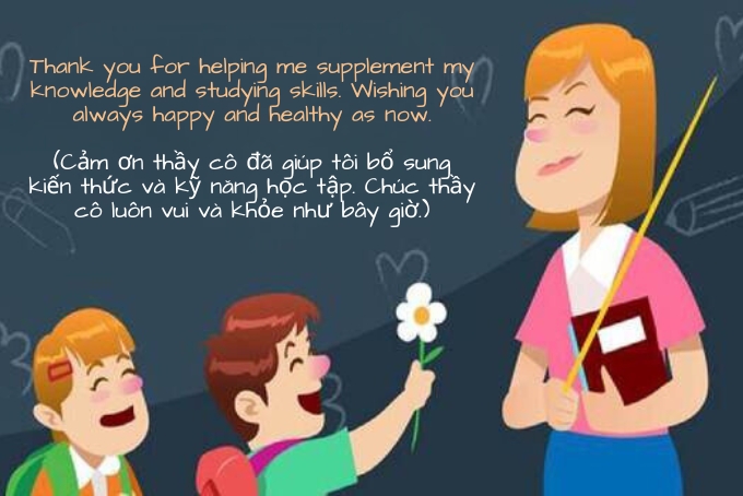 (Em có được ngày hôm nay là nhờ công lao của thầy cô. Em mong thầy cô luôn vui vẻ và hạnh phúc. Chúc mừng ngày nhà giáo Việt Nam!)