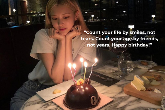 - “Count your life by smiles, not tears. Count your age by friends, not years. Happy birthday!”/ “Hãy đếm cuộc đời bạn bằng những nụ cười chứ không phải những giọt nước mắt. Đếm tuổi của bạn bằng bạn bè, không phải năm. Chúc mừng sinh nhật!”