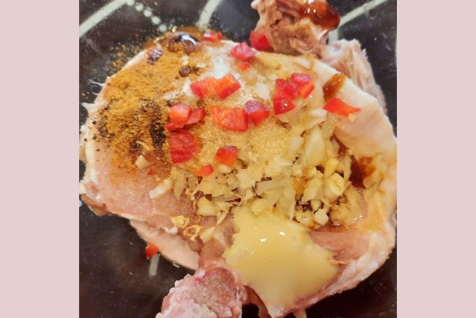 - Sườn cốt lết sau khi làm mềm cho sườn vào bát tô lớn rồi ướp cùng 1 muỗng hạt nêm, 3 muỗng mắm, 3 muỗng dầu hào, 3 muỗng tương ớt, 1 muỗng bột ngọt, 100 ml sữa tươi cùng tỏi và ớt vào thịt sườn cốt lết rồi dùng đũa hoặc dùng tay deo bao tay trộn đều thịt sườn lên cùng gia vị cho đều rồi để sườn cốt lết nghỉ trong khoảng 45 - 60 phút cho thịt sườn được thấm gia vị.