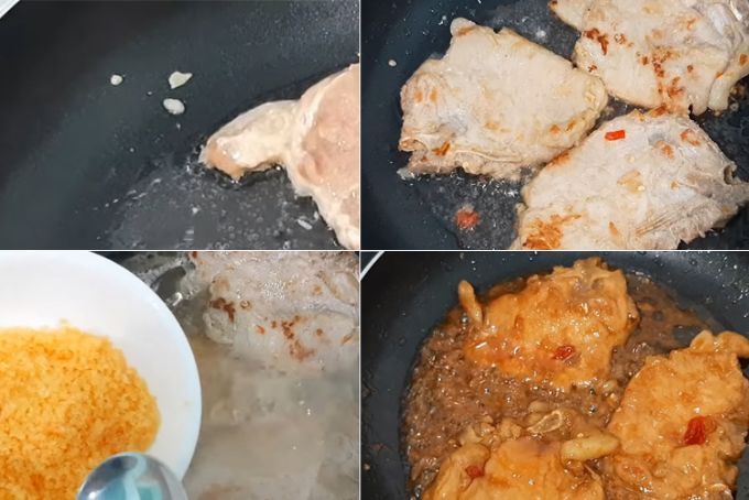 - Cho chảo lên bếp làm nóng cho thêm 3 muỗng dầu ăn vào đun sôi rồi cho sườn cốt lết đã ướp vào chiên vàng hai mặt, tiếp theo cho thêm 1 bát nước lọc vào cùng 5 muỗng đường vào đun tới khi thấy nước trong chảo ở độ sền sệt thì lật đều thịt lên cho hai mặt được ngấm nước sốt và chín đều ngon hơn.