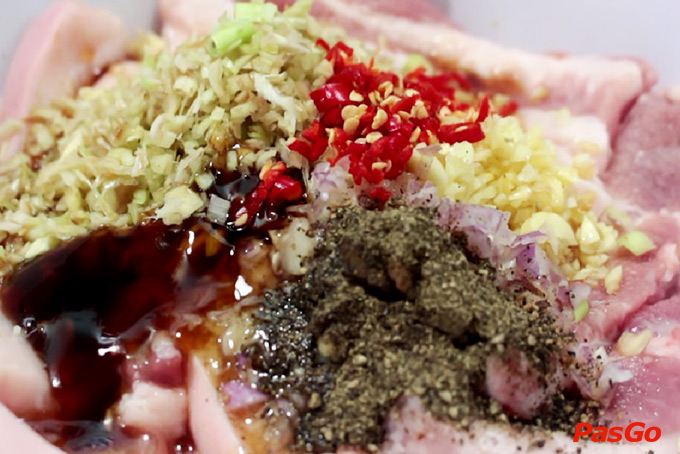 Hỗn hợp ướp thịt gồm: 1 thìa canh hành khô băm, 1 thìa canh tỏi băm, 3 thìa canh sả băm, 3 thìa canh nước mắm, 1 thìa cafe hạt nêm, 1 thìa cafe tiêu, 1 thìa canh dầu hào, 1 thìa canh mật ong, 1 ít ớt băm (tùy khẩu vị), 1 thìa canh dầu ăn