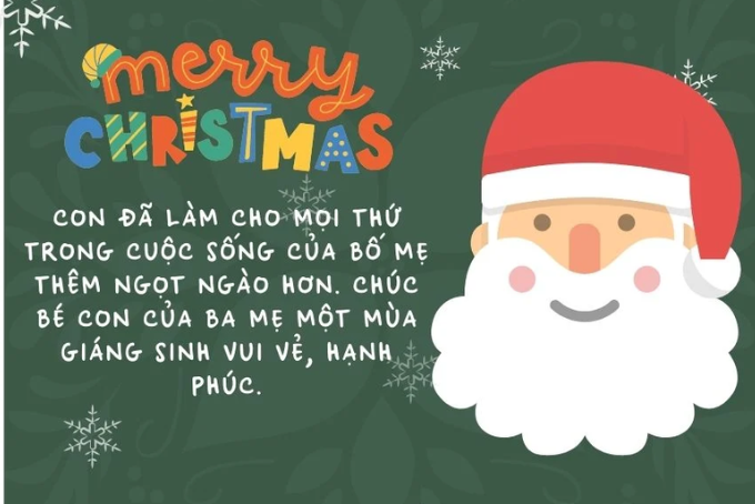 Lời chúc 5: Dù ngàn lời chúc Giáng Sinh nhưng vẫn không đủ để diễn đạt tình yêu thương mà bố mẹ dành cho con. Chúc con được nhiều hạnh phúc và sức khỏe. Bố mẹ sẽ luôn ở bên con và ủng hộ con.