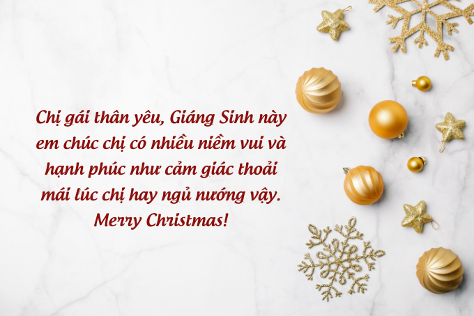 Lời chúc 1: Chị gái thân yêu, Giáng Sinh này em chúc chị có nhiều niềm vui và hạnh phúc như cảm giác thoải mái lúc chị hay ngủ nướng vậy. Merry Christmas!"