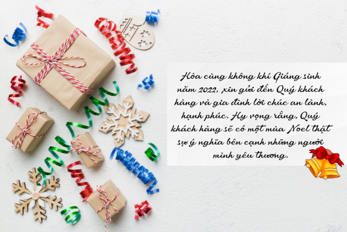 Lời chúc 3: Mùa Giáng Sinh này, chúng tôi muốn gửi đến quý khách hàng lời chúc ấm áp nhất. Chúc bạn và gia đình có những khoảnh khắc đáng nhớ và hạnh phúc. Xin chân thành cảm ơn sự tiên yêu của bạn, và hy vọng tiếp tục có cơ hội phục vụ bạn trong năm mới.