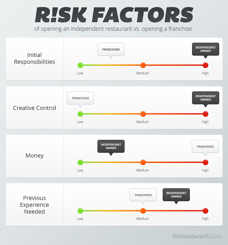 Biểu đồ này nêu bật từng yếu tố rủi ro được đề cập ở trong bài viết trên cũng như “vị trí” mà một nhà điều hành nhượng quyền và một chủ sở hữu nhà hàng độc lập đứng trên thang đo: