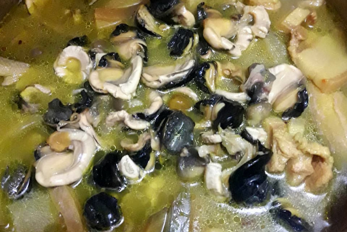 - Bước 5: Cuối cùng bạn cho nốt nước mẻ, nghệ, mắm tôm, 1 thìa gia vị, đậu đã chiên vào cùng rồi thêm lượng nước dùng vừa đủ xâm xấp mặt nguyên liệu trong nồi, nấu khoảng 5-10 phút thì cho ốc đã xào vào cùng rồi nêm nếm lại cho vừa khẩu vị.