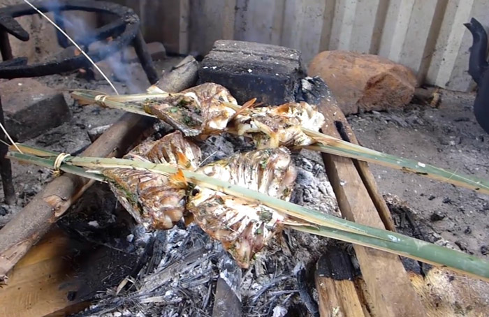 - Khi cá được ướp xong thì gập đôi mình cá theo chiều ngang lại và kẹp bằng các thanh tre hoặc kẹp bằng vỉ. Sau đó đem nướng trên than củi gỗ rừng.