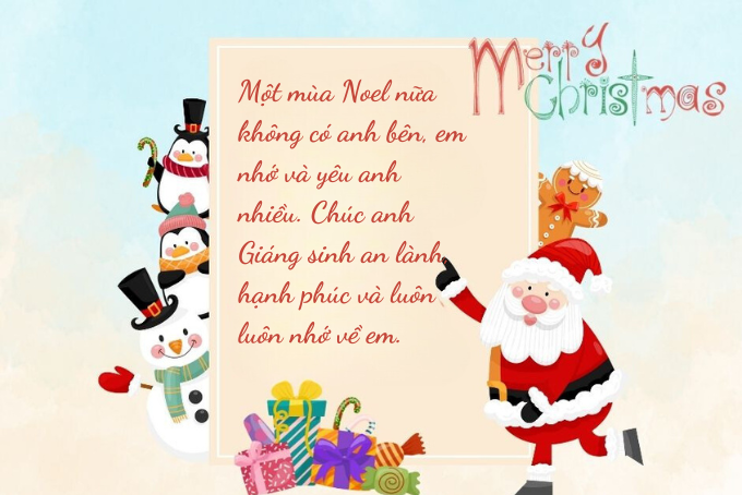 1. Một mùa Noel nữa không có anh bên, em nhớ và yêu anh nhiều. Chúc anh Giáng sinh an lành, hạnh phúc và luôn luôn nhớ về em.