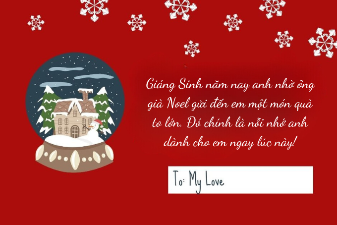 2. Em yêu à! Giáng Sinh này có thể chúng ta cách xa nhau nhưng hãy luôn nhớ rằng anh vẫn luôn giữ tình yêu em trong trái tim. Chúc em tất cả những gì tốt đẹp nhất. Merry Christmas!
