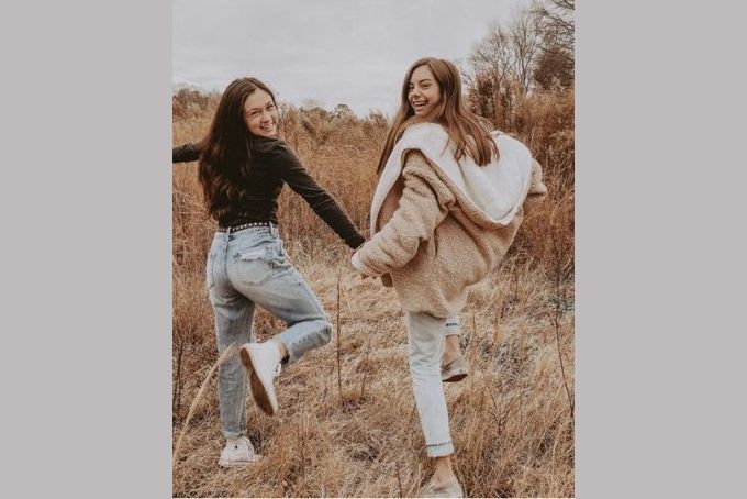 2 người bạn thân vừa nắm tay nhau vừa bước đi và cười hồn nhiên và vui nhộn. Kiểu tạo dáng chụp ảnh 2 người nữ này thể hiện sự gắn kết tình cảm giữa hai người, phản ánh qua nụ cười rạng rỡ trên khuôn mặt cả hai.