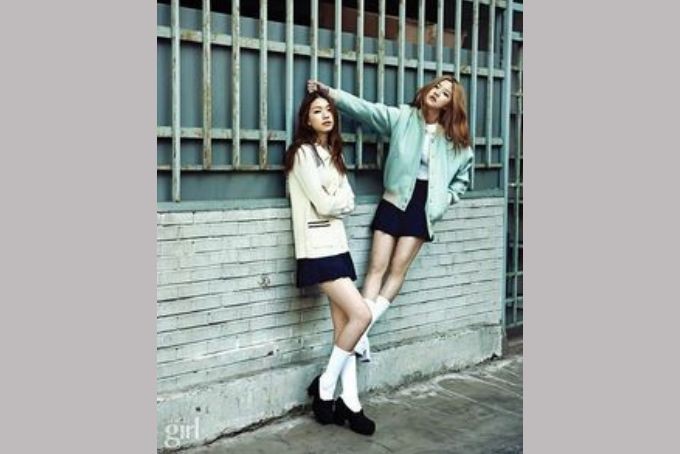 Cách tạo dáng chụp ảnh đôi nữ cực ngầu với 1 bạn đứng lên hàng tường rào đứng nghiêng người, 1 bạn đứng dưới co nhẹ một chân, cả hai người cùng nhìn về phía máy ảnh.