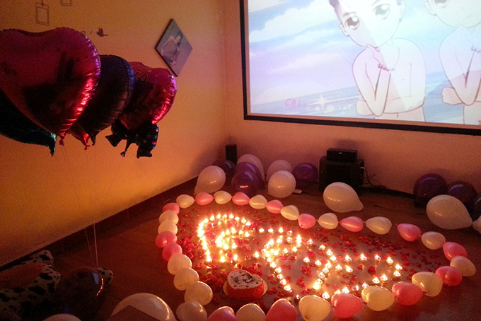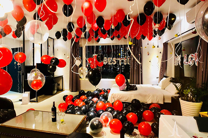 Ngoài ra, bạn cũng thể dùng bóng bay sinh nhật dải khắp sàn khu vực tổ chức tiệc. Thêm một chút hoa hồng và nến thơm sẽ càng làm cho xúc hai bạn thêm thăng hoa.