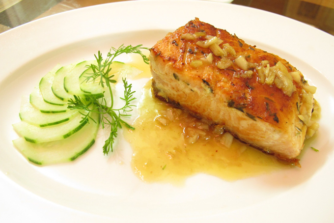 - Bữa tối: (18h00) Cá hồi áp chảo sốt bơ