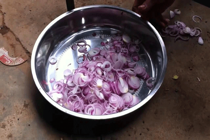 - Hành khô bóc vỏ, thái lát mỏng, trải đều ra khay phơi nắng 1 giờ cho hơi se lại, mục đích giúp hành phi giòn.
