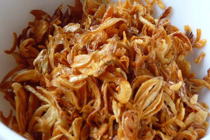 - Mỡ sôi thả hành đã thái vào, vặn lửa nhỏ và phi đến khi hành có màu vàng ruộm thì tắt bếp. Vớt hành và trải đều ra giấy thấm dầu cho ráo mỡ.