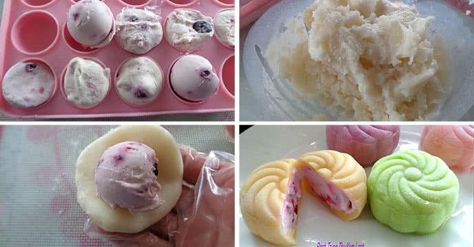 Bước 4: Để viên bột hơi mỏng co nhân kem vào, rồi nhanh tay túm mí, cho vào khuôn ấn đều là lấy bánh ra.