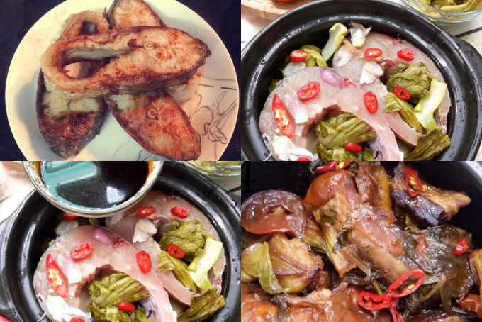 Kho cá đến khi nước gần cạn, cá có màu vàng nâu đẹp mắt thì tắt bếp