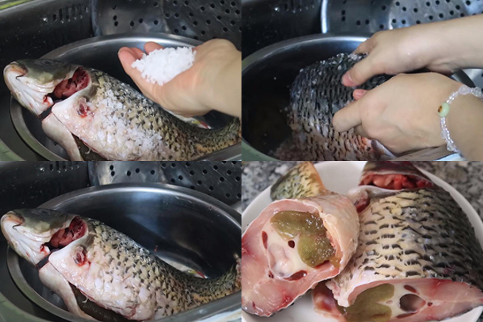 Cá chép làm sạch, dùng muối chà xát rồi rửa lại với nước để khử sạch mùi tanh của cá.