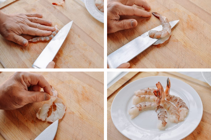 Đặt tôm nằm nghiêng, lưng úp vào dao. Cứa khoảng 2/3 phần lưng tôm. Khi mặt sau được tách ra, bạn có thể dễ dàng loại bỏ đường chỉ đen. Bây giờ tôm của bạn đã sẵn sàng cho công thức của bạn!