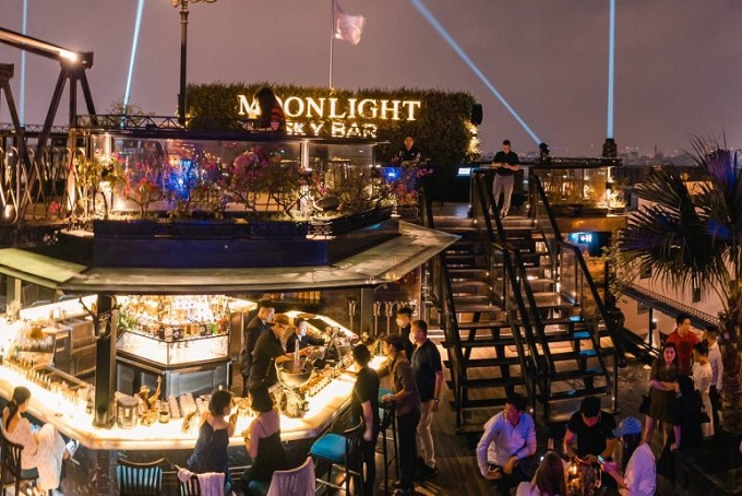 Rooftop Moonlight Sky Bar được mệnh danh là địa điểm check-in sang chảnh, hiện đại với quầy bar bát giác lung linh ánh đèn. Đây chính là điểm nhấn đặc sắc làm siêu lòng thực khách tại Hà Nội. Có thể nói quán bar này đã quy tụ mọi điểm nhìn, góc view có khả năng bắt trọn vẻ đẹp huyền dịu của dòng sông Hồng, giúp du khách tận hưởng làn gió mát lành giữa khung cảnh phố phường tấp nập.