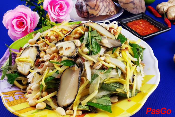 Gỏi ốc giác là món ăn đặc sản Bình Thuận khiến thực khách yêu thích bởi độ giòn sần sật và hương vị chua cay bắt miệng. Món ăn này đặc biệt hợp khi dùng kèm bánh tráng nướng mắm ruốc Bình Thuận.