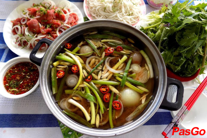 Bò được thái mỏng, nhúng vừa chín tới để giữ độ mềm ngọt. Đây là đặc sản Đắk Lắk rất được ưa chuộng trong các buổi liên hoan, đặc biệt khi ăn cùng rau rừng và rượu cần.