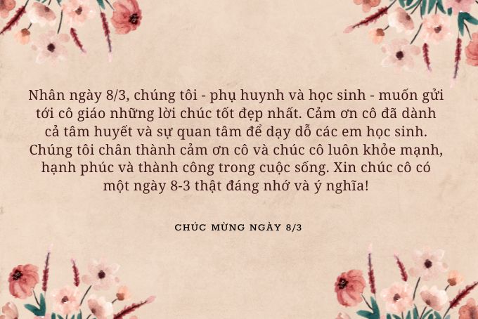 Lời chúc 3: Nhân ngày 8-3, chúng tôi - phụ huynh và học sinh - muốn gửi tới cô giáo những lời chúc tốt đẹp nhất. Cảm ơn cô đã dành cả tâm huyết và sự quan tâm để dạy dỗ các em học sinh. Chúng tôi chân thành cảm ơn cô và chúc cô luôn khỏe mạnh, hạnh phúc và thành công trong cuộc sống. Xin chúc cô có một ngày 8-3 thật đáng nhớ và ý nghĩa!