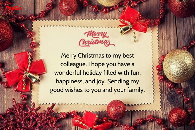 (Chúc mừng Giáng sinh tới đồng nghiệp tốt nhất của tôi. Tôi chúc bạn có một kỳ nghỉ tuyệt vời tràn ngập niềm vui, hạnh phúc và niềm vui. Gửi lời chúc tốt đẹp của tôi đến bạn và gia đình bạn.)