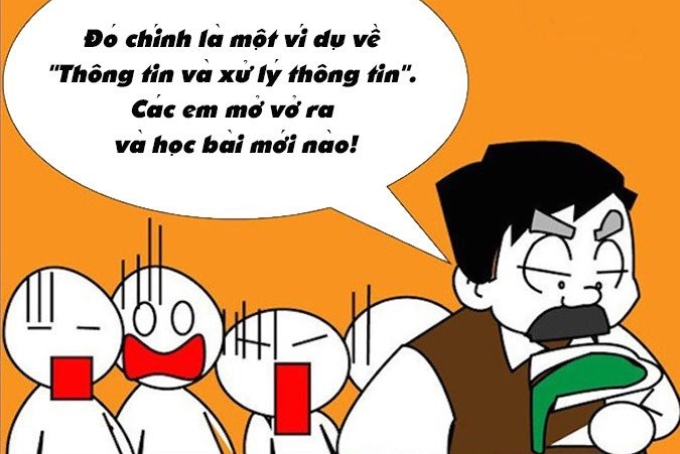 Thầy: “Tốt! Đó chính là một ví dụ về ‘Thông tin và xử lý thông tin’. Các em mở vở ra và học bài mới nào!”