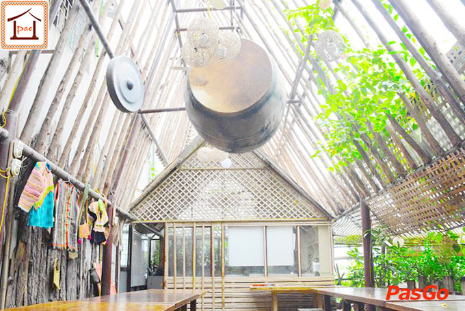 Chắc chắn ai cũng bị choáng ngợp trước không gian 3 tầng của Pao Quán. Với mái lá đơn sơ giản dị thôi nhưng Pao Quán lại vô cùng nổi bật giữa góc phố nhỏ. Bước vào bên trong, chắc hẳn bạn sẽ “ kết”ngay từ cái nhìn đầu tiên. Pao như một thế giới khác tách biệt với vẻ ồn ào, xô bồ của Hà Nội. Nơi đây toát lên sự thanh bình, yên ả với tiếng nước chảy róc rách bên những bụi hoa lá xôn xao, làm dịu lại mỗi tâm hồn. như một góc Tây Bắc thu nhỏ giữ chốn Hà Thành.