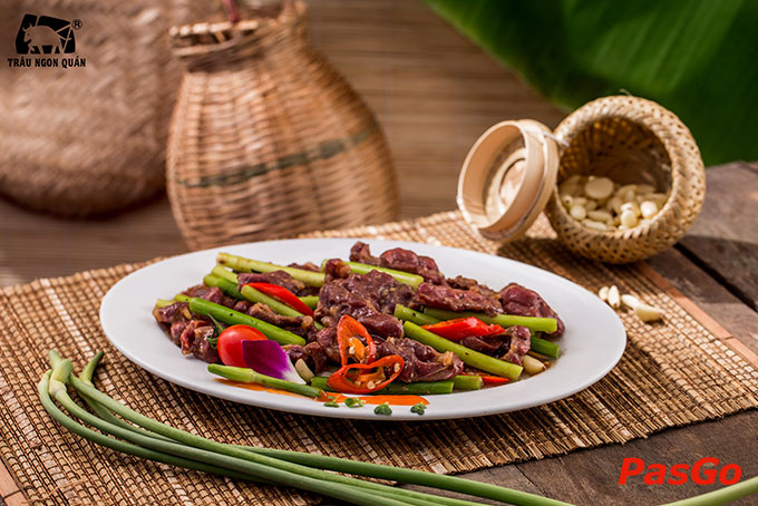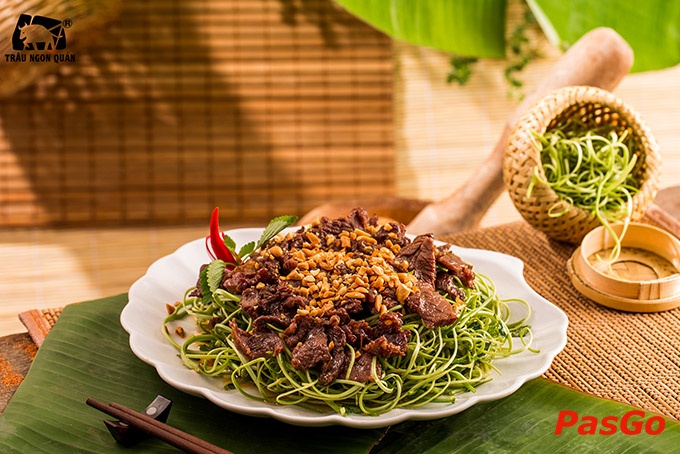 Trâu Ngon Quán thu hút thực khách bởi thực đơn 108 món đặc sản thịt trâu “giật”: Trâu cháy tiêu xanh, Trâu cuốn cải, Trâu xào hoa bách hợp, Nộm rau muống bắp trau, Trâu sốt vang, Trâu rang muối, Trâu sốt tiêu đen, Trâu nhúng, Lẩu Trâu thập cẩm, Trâu om lá lồm, Trâu xé muối trứng kiến, sườn trâu nướng mật ông, Sách trâu,… tất cả đều được chế biến bởi các đầu bếp chuyên nghiệp, giàu kinh nghiệm. Mỗi tháng các đầu bếp tại đây đều sáng tạo ra hai món thịt trâu mới, giúp thực khách được thưởng thức những món ngon mới lạ nhưng vẫn giữ được hương vị thơm ngon khó lẫn của thịt trâu. Tuy nhiên, quản lý tại Trâu Ngon Quán cho biết nhà hàng không bán đại trà đủ 108 món mỗi ngày bởi còn liên quan đến nguồn hàng, bảo quản. “Chúng tôi phục vụ chính 50-52 món về trâu, mỗi giai đoạn sẽ giới thiệu những món khác nhau”, vị này cho biết thêm.