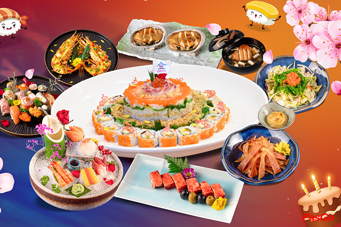 Chiếc bánh sinh nhật chế biến từ các loại hải sản tươi ngon nhất theo ngày, bao gồm: cá hồi, cá ngừ, trứng tôm...