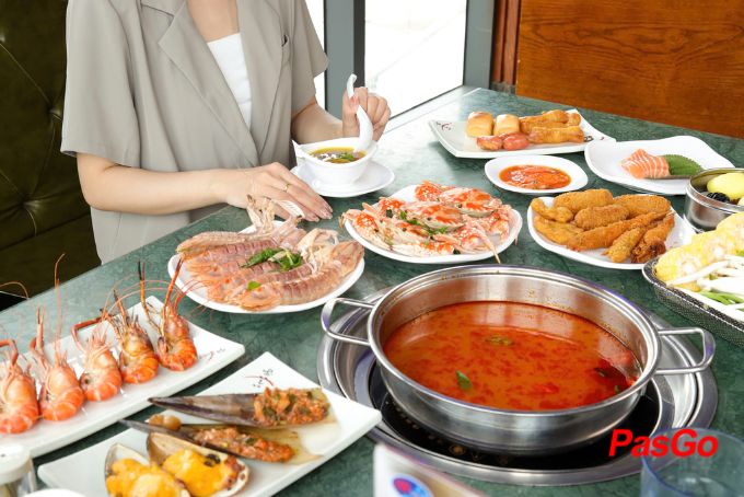 Menu phục vụ Bạch tuộc, Ốc, Hàu, Tôm càng xanh... được vớt sống tại bể. Thỏa thích ăn buffet thả ga không giới hạn các món. Nhà hàng buffet hải sản tại Hải Phòng này phục vụ cả ngày.