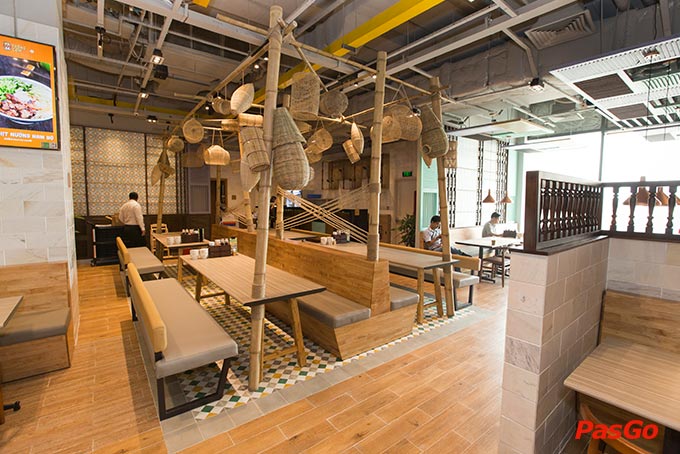 • Tiện ích nổi bật: Có ghế trẻ em, không gian hoài cổ với concept trang trí bằng vật dụng dân gian làm từ tre nứa.