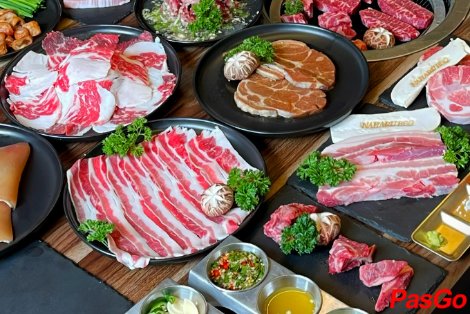 Bàn tiệc buffet nướng đầy ắp các loại thịt tại Naharu BBQ