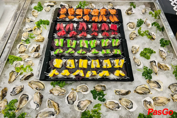 Buffet Sen Á Đông mang đến trải nghiệm ẩm thực mang phong cách Á Đông kết hợp buffet hải sản tươi ngon như mực nướng, hàu, cá hấp... Món ăn được trình bày đẹp mắt, đậm đà hương vị.
