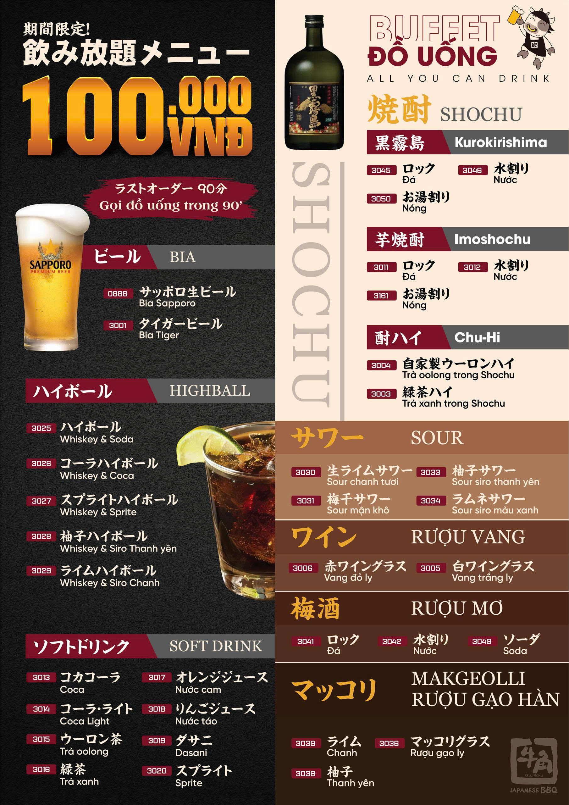 - Buffet đồ uống bao gồm đồ uống có cồn và không cồn, gọi đồ trong 90 phút.