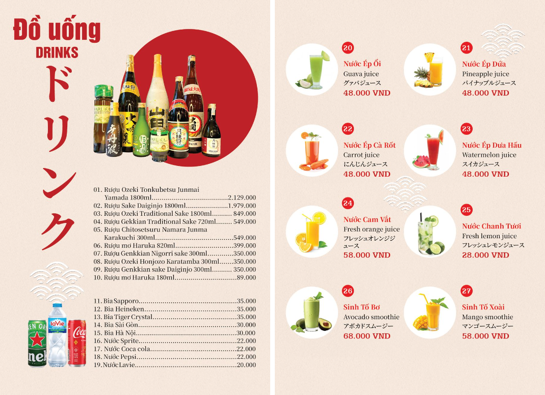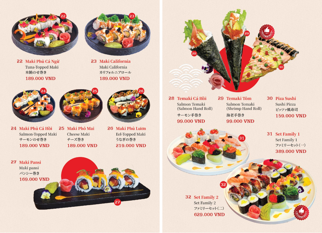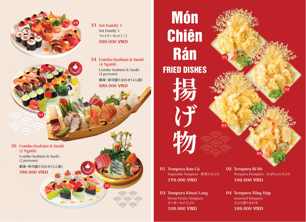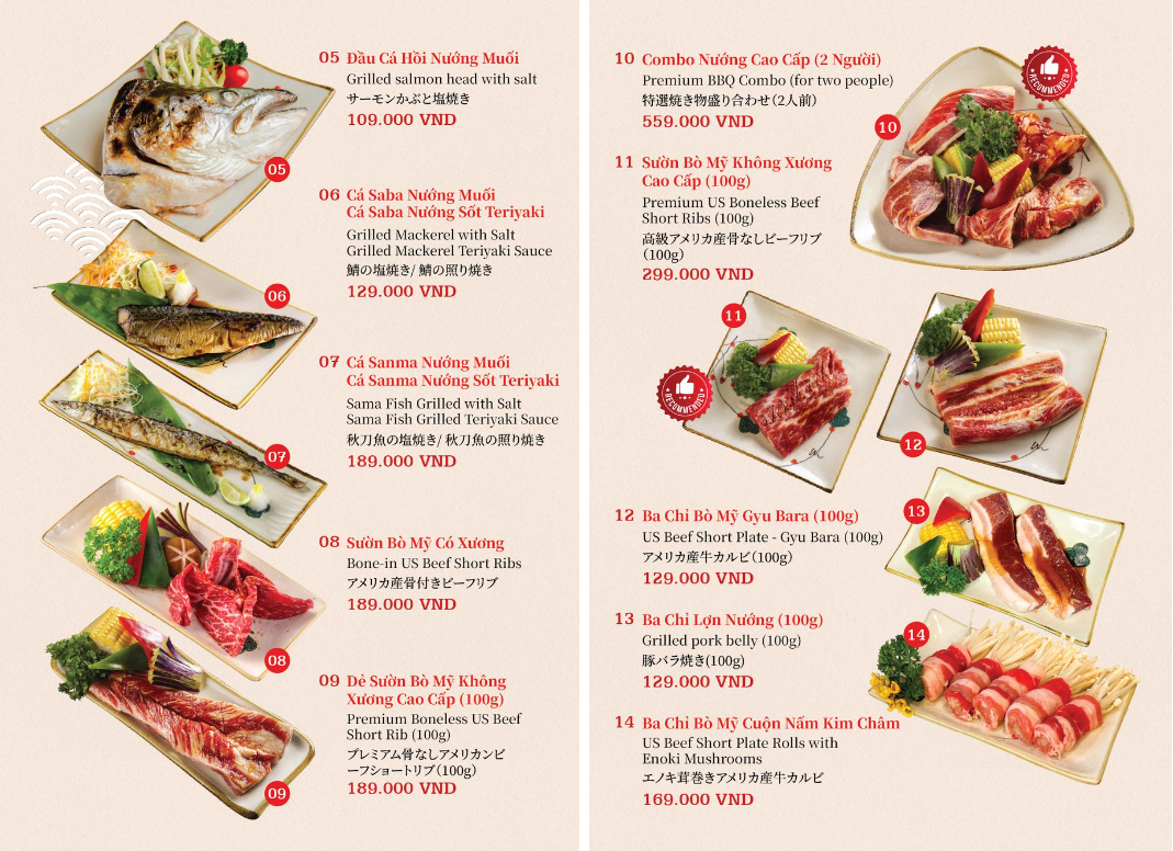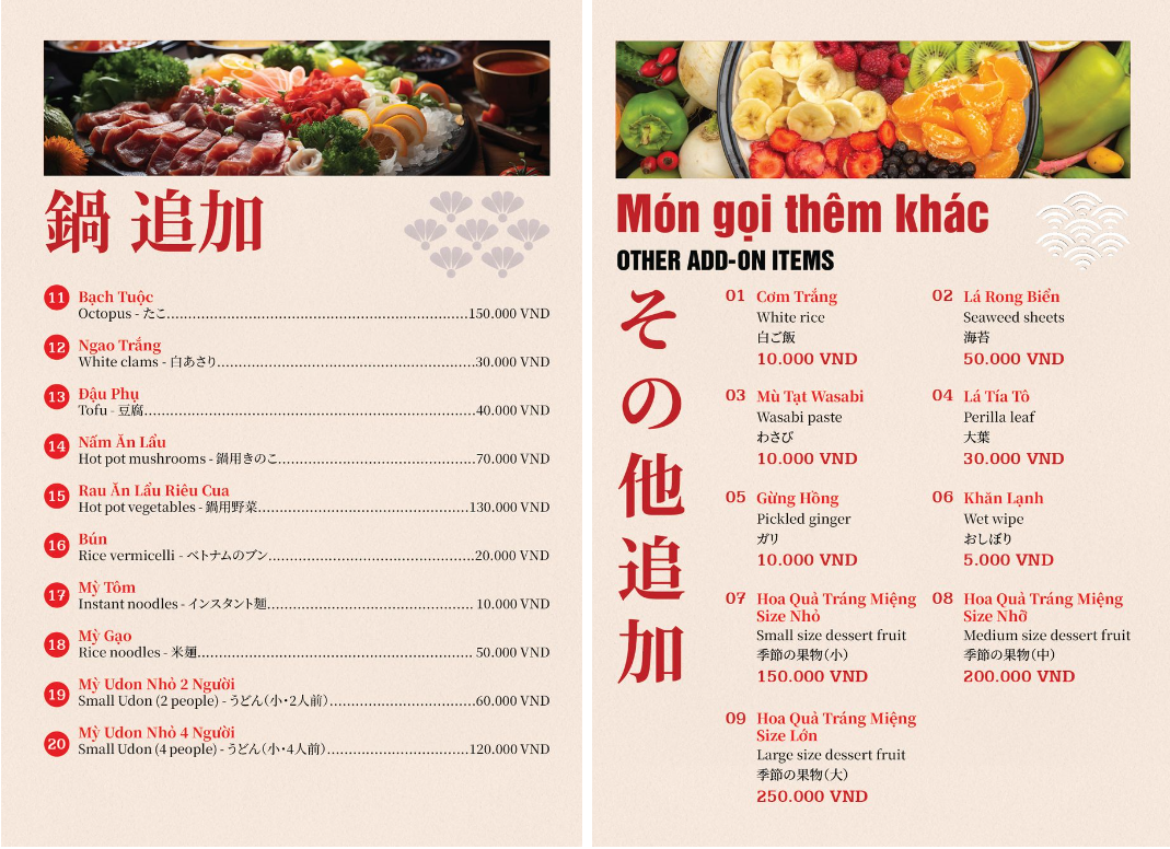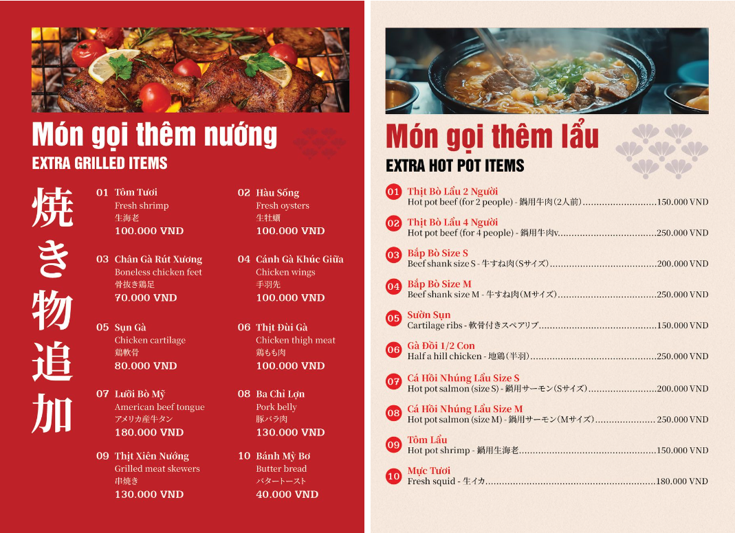 - Hoá đơn VAT: giá menu đã bao gồm VAT.
