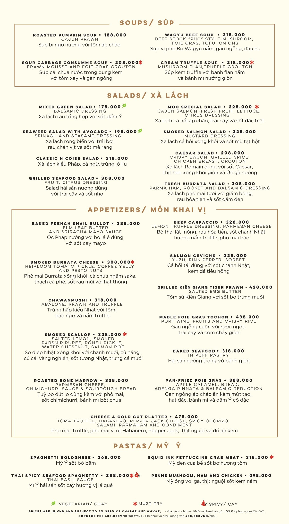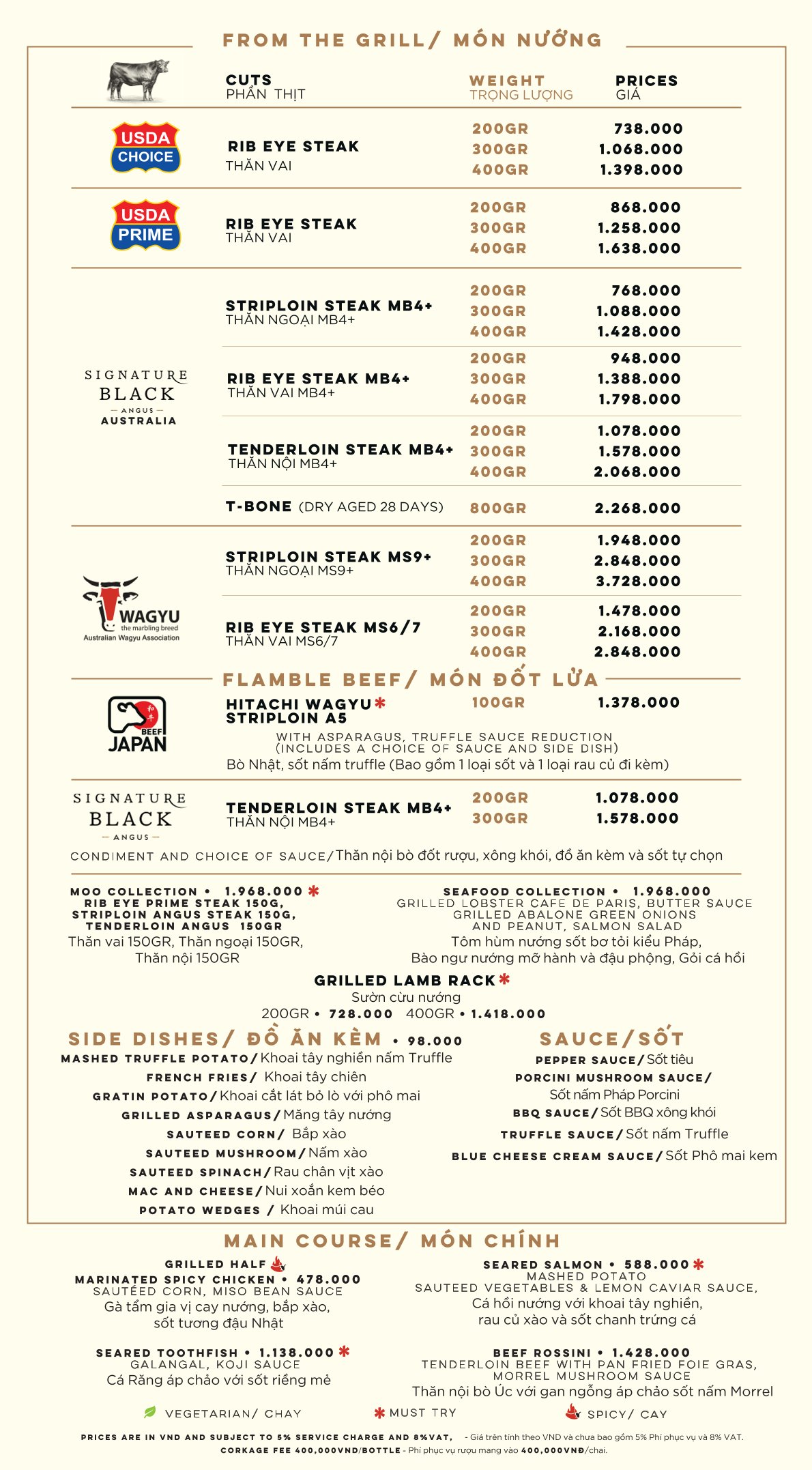 - Giá menu chưa bao gồm VAT, phí dịch vụ. Nhà hàng luôn thu 8% VAT và 5% phí dịch vụ.