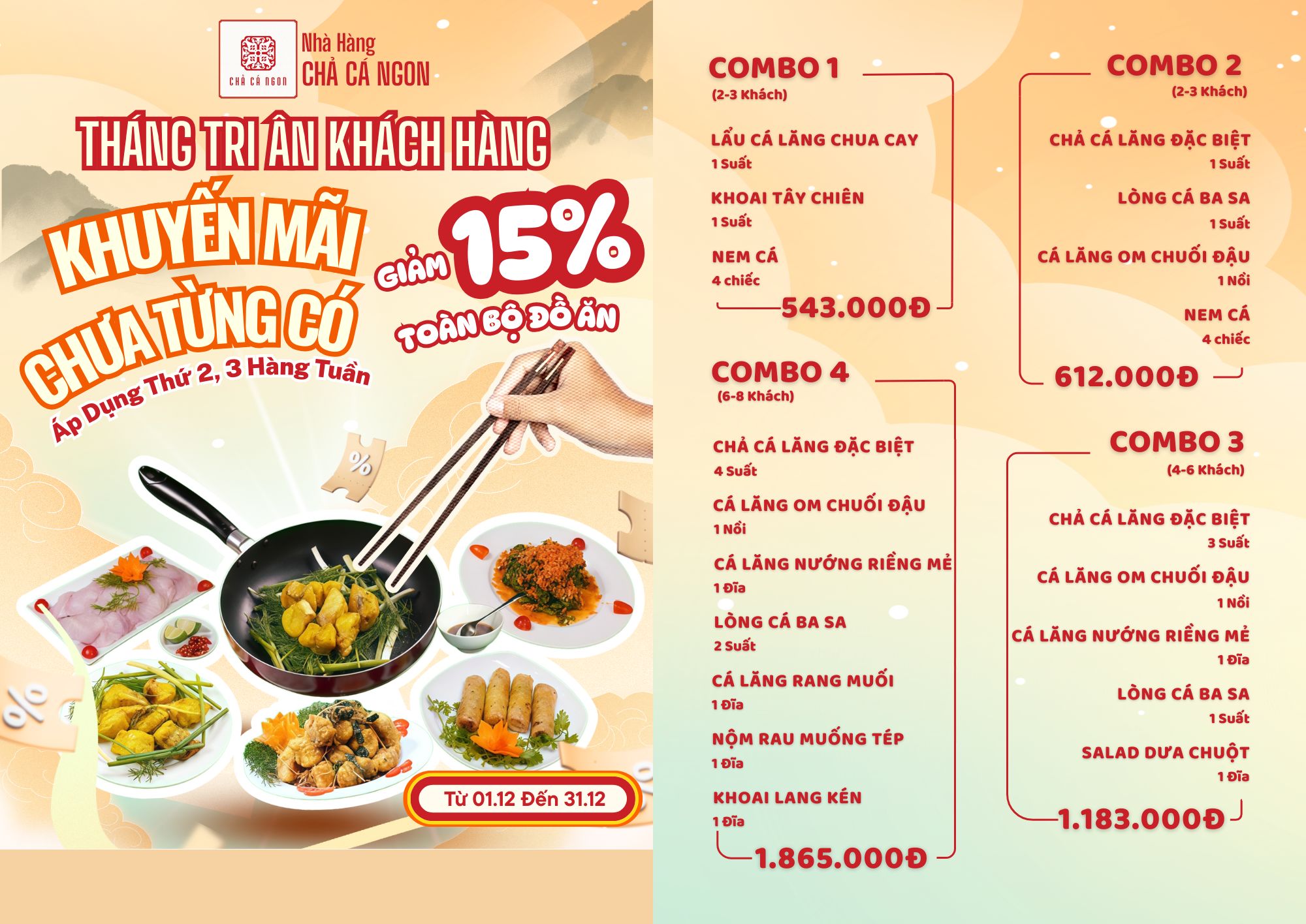 - Giảm 15% toàn bộ đồ ăn, áp dụng vào mỗi thứ 2 & thứ 3 hàng tuần.
