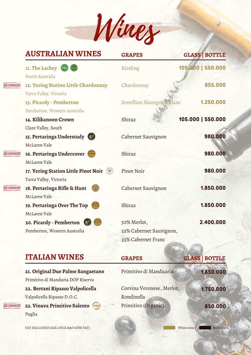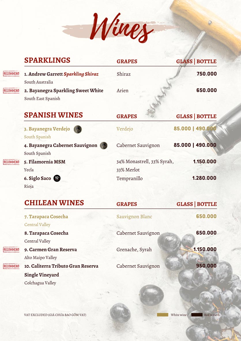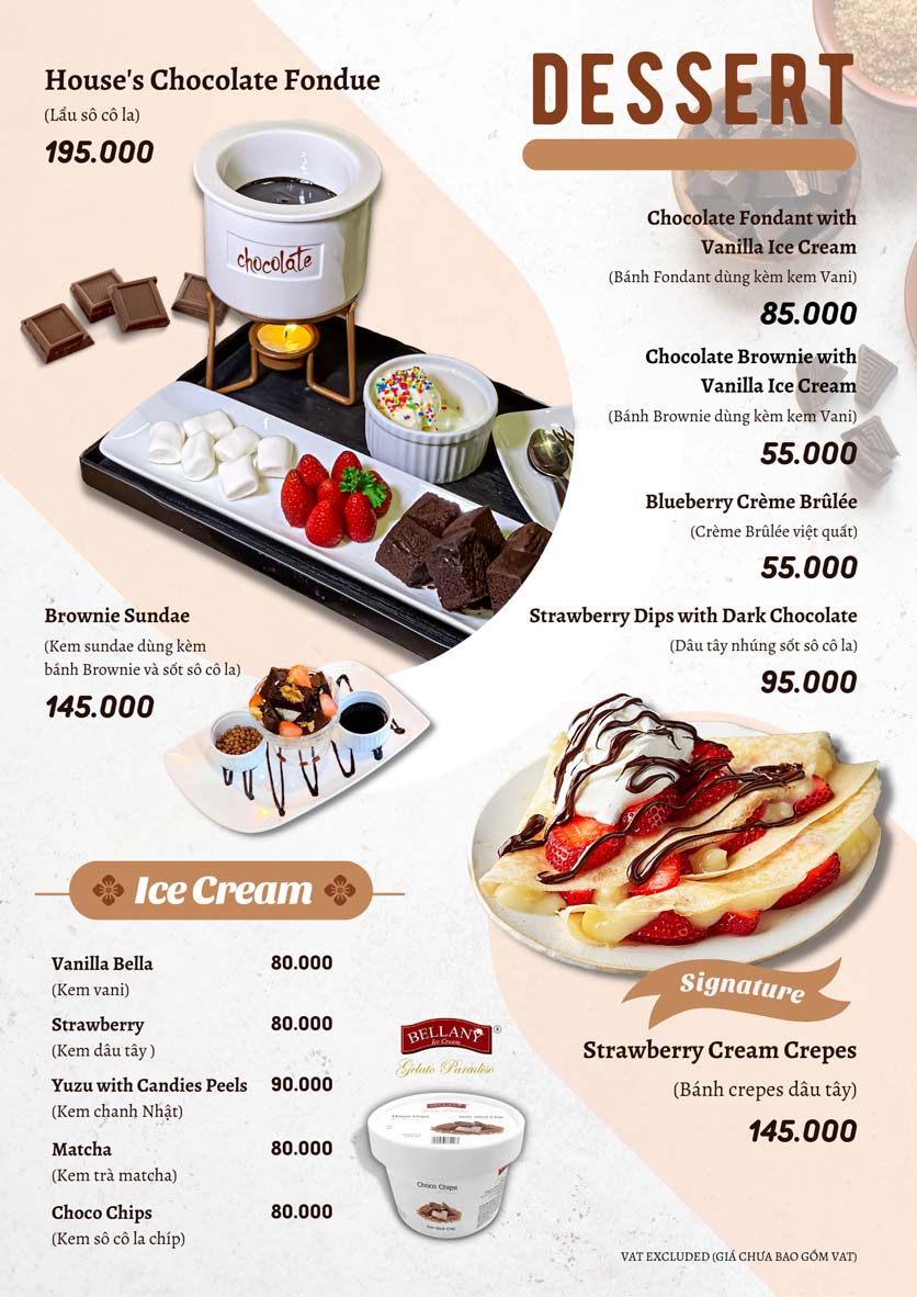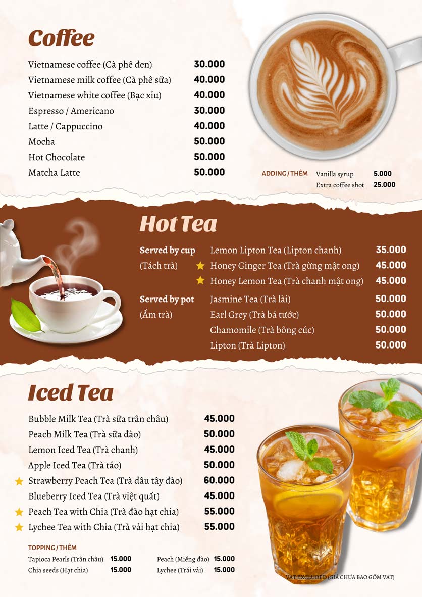 - Giá menu chưa bao gồm VAT. Nhà hàng luôn thu VAT theo Luật hiện hành.